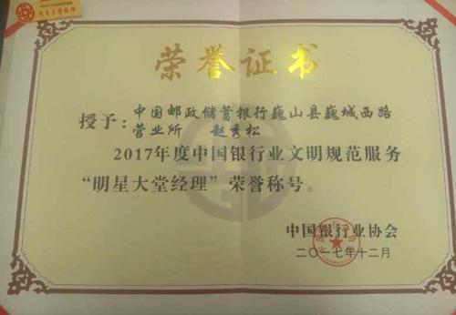 近日,在2017年中國銀行業(yè)“明星大堂經(jīng)理”評選活動中,大理州巍山縣分公司趙秀松同志以出色的表現(xiàn)榮獲中國銀行業(yè)文明規(guī)范服務(wù)“明星大堂經(jīng)理”稱號。