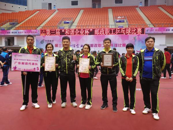 在為期四天的比賽里,來自中國郵政集團各控股子公司、31個?。▍^(qū)、市)郵政分公司、總部機關、直屬單位,以及香港郵政、澳門郵電的38支代表隊共346名運動員進行了男女混合團體、高管單打等9個項目的激烈角逐。我省郵政體協選派了李騰飛(廣州市分公司),唐媛(深圳市分公司),劉青(梅州市分公司),胡永強(東莞市分公司),徐寶玉(廣州郵區(qū)中心局),關華昌(信源集團)等6位隊員組成廣東郵政代表隊參加本次的比賽,最終取得了第三屆“和諧企業(yè)杯”郵政職工乒乓球比賽道德風尚獎、最具人氣獎、劉青榮獲女子甲組單打第二名、唐媛榮獲女子專業(yè)組單打第五名的優(yōu)異成績,為廣東郵政贏得了榮譽,并得到集團公司領導的肯定和贊許。