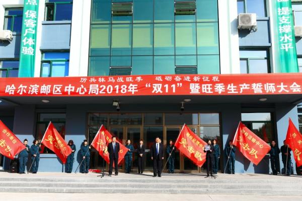 10月25日,中國(guó)郵政集團(tuán)公司哈爾濱郵區(qū)中心局召開迎戰(zhàn)2018年“雙11”暨旺季生產(chǎn)誓師大會(huì),全面動(dòng)員部署“雙11”及旺季生產(chǎn)各項(xiàng)工作。會(huì)上,來自該郵區(qū)中心局各條戰(zhàn)線的六個(gè)代表隊(duì)分別做了表態(tài)發(fā)言,黑龍江省寄遞事業(yè)部副總經(jīng)理、哈爾濱郵區(qū)中心局總經(jīng)理金龍為各個(gè)代表隊(duì)授“突擊隊(duì)”旗幟。