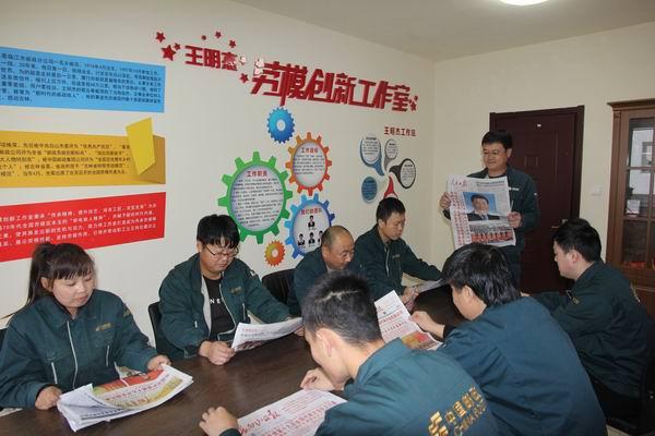 圖為王明杰(站立者)帶領(lǐng)工友一起開(kāi)展班組學(xué)習(xí)活動(dòng)