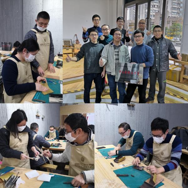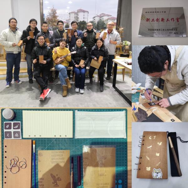創(chuàng)新工作室的同志們興致盎然,耐心地聽了工具介紹和操作要點(diǎn)講解后,迫不及待地穿上工作圍裙,個個躍躍欲試:在專業(yè)指導(dǎo)下,對木材料進(jìn)行打磨、上蠟、拼接、粘合、燙金......每組結(jié)對師徒還不忘動手合作,忙得不亦樂乎,仿佛重現(xiàn)創(chuàng)新工作室一派熱火朝天的工作場景。大家度過了一個輕松愉快的下午,暫時告別局內(nèi)工作室的忙碌和代碼,在做中學(xué),在學(xué)中收獲,在收獲中享受快樂,把愛融入木作,制作出專屬自己的小作品——匠心鋼筆和思如泉涌筆記本。