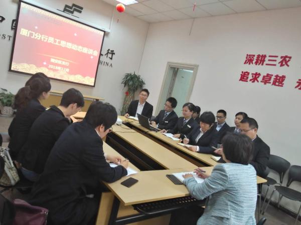 為認(rèn)真貫徹總行工會(huì)關(guān)于推進(jìn)員工思想動(dòng)態(tài)調(diào)研的的工作部署,為進(jìn)一步發(fā)揮工會(huì)貼近基層、貼近員工的優(yōu)勢(shì),真實(shí)反映廣大員工的訴求和呼聲,近日,廈門分行李芳工會(huì)主席帶領(lǐng)分行工會(huì)辦公室、工會(huì)經(jīng)審委和女工委相關(guān)人員赴同安、翔安區(qū)支行開展員工思想動(dòng)態(tài)調(diào)研,深入了解員工的思想情況及日常工作情況、收集員工在日常工作中存在的困難和建議,為維護(hù)職工權(quán)益找準(zhǔn)方向,為企業(yè)科學(xué)決策提供依據(jù)。