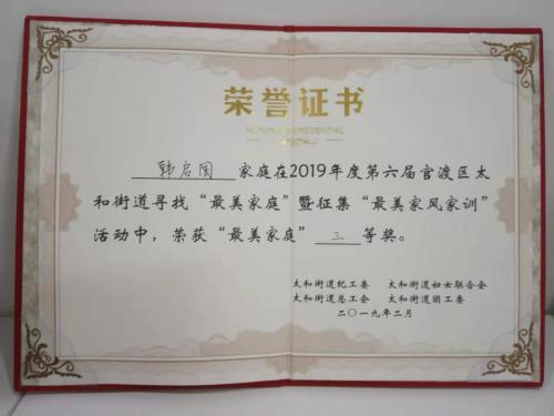 經(jīng)大賽評(píng)審團(tuán)考評(píng),韓啟國(guó)家庭在第六屆官渡區(qū)太和街道“最美家庭”暨征集“最美家風(fēng)家訓(xùn)”活動(dòng)中,榮獲“最美家庭”三等獎(jiǎng)。(云南郵政工會(huì))