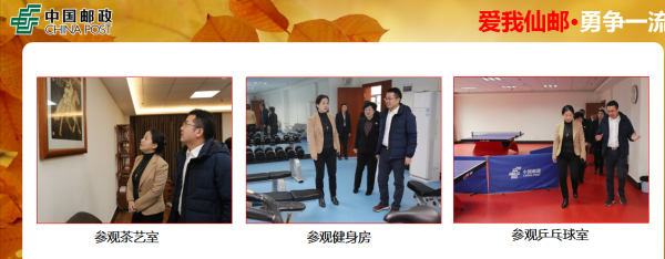 吳靜一行還參觀了由市分公司與市總工會(huì)聯(lián)合打造的戶外職工“愛(ài)心驛站”和市分公司建成的“職工之家”。對(duì)仙桃郵政關(guān)愛(ài)戶外職工、奉獻(xiàn)愛(ài)心的舉措稱贊不已,對(duì)仙桃郵政履行國(guó)企擔(dān)當(dāng)、熱心公益事業(yè)予以肯定。在“職工之家”的職工活動(dòng)中心,吳靜對(duì)企業(yè)拿出1000多平米建設(shè)茶藝室、書畫室、乒乓球室、器材房、瑜伽房、兒童樂(lè)園大加贊賞,認(rèn)為仙桃郵政關(guān)心關(guān)愛(ài)職工業(yè)余文化生活有陣地、有亮點(diǎn),做得細(xì)、做得實(shí),值得其他企業(yè)學(xué)習(xí)和借鑒。