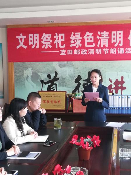 春風(fēng)送暖,又逢清明,再過(guò)兩天,2019年清明節(jié)就要到來(lái),在這緬懷先烈、祭奠逝者、追思故人的傳統(tǒng)節(jié)日到來(lái)之際,為形成“綠色清明、文明祭祀”的良好氛圍,以健康、文明、低碳、有序的形式進(jìn)行,提升城鄉(xiāng)文明形象,藍(lán)田郵政分公司于4月3日組織職工開(kāi)展“文明祭祀,綠色清明”詩(shī)歌朗誦活動(dòng)。