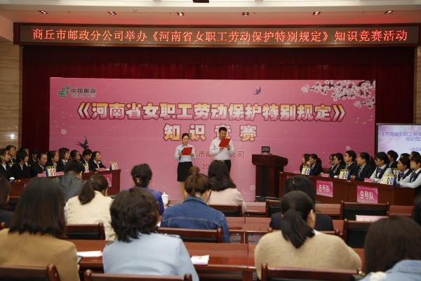 為進(jìn)一步推動(dòng)保障女職工權(quán)益法律法規(guī)的學(xué)習(xí)和普及,促進(jìn)保護(hù)女職工權(quán)益法律法規(guī)的貫徹落實(shí),商丘市郵政分公司于近日舉辦了商丘市郵政系統(tǒng)《河南省女職工勞動(dòng)保護(hù)特別規(guī)定》知識(shí)競(jìng)賽。來(lái)自各縣(市、區(qū))分公司、市分公司和寄遞事業(yè)部共11個(gè)代表隊(duì)參加了本次競(jìng)賽活動(dòng)。