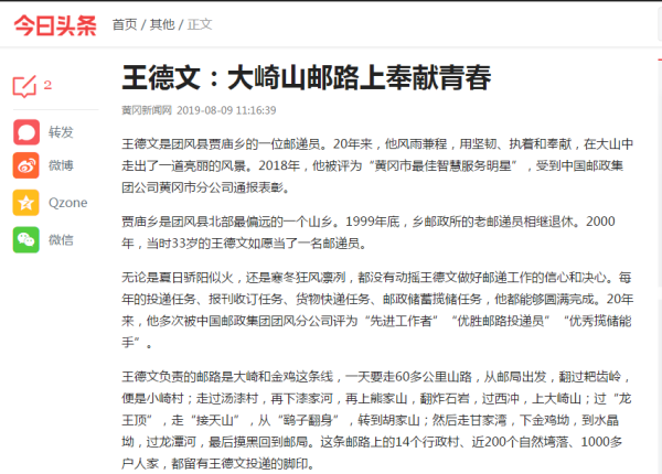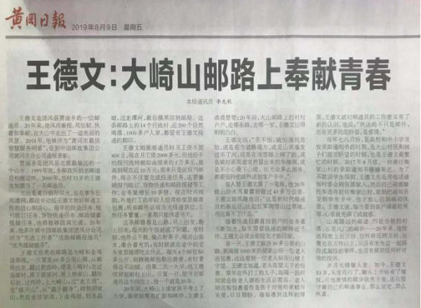 8月9日,《黃岡日?qǐng)?bào)》、黃岡新聞網(wǎng)分別以《王德文:大崎山郵路上奉獻(xiàn)青春》為題,報(bào)道了團(tuán)風(fēng)縣賈廟郵政支局投遞員王德文的先進(jìn)事跡,引起了社會(huì)廣泛關(guān)注。