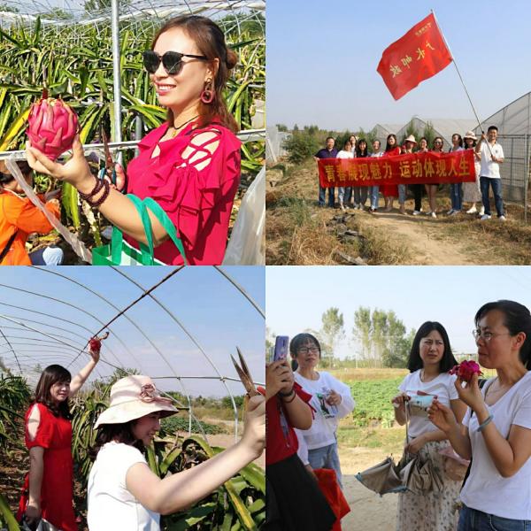 秋高氣爽的季節(jié),秋老虎有恃無恐,照在臉上火辣辣的,大家依然興致勃勃。到了田間地頭,一群成年人竟變成了好奇開心的小學(xué)生,連環(huán)炮的向農(nóng)場主發(fā)問:“火龍果竟長在這帶刺的植株上,是不是仙人掌科呀?”“什么樣的火龍果才是肉多汁甜呀?”“植株上這么多刺,怎樣采摘不受傷呀?”沒等農(nóng)場主一一解釋清楚,大家忍不住躍躍欲試了。有的空手赤拳,直接去擰;有的戴上手套,有備而來;有的兩人搭檔,一人頂著果實,一人剪切……大家三個一群,兩個一伙,摘著果實,聊著天,話著家常,拍著照片,發(fā)著抖音,忙得不亦樂乎。火龍果植株上的刺刺傷了手,劃傷了臉,沾到了衣服,大家也渾然不覺,回到大自然的懷抱,大家率性的開啟著生命的本真,盡情釋放著工作中的壓力,享受著生活中最簡單最原始最愜意的快樂。