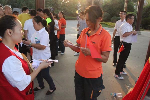 當天清晨6:00,活動在大家齊聲共唱《我和我的祖國》中拉開了序幕。隨后,在旗手的引領下,大家迎著初升的第一縷朝陽,列隊進入汝水森林公園。