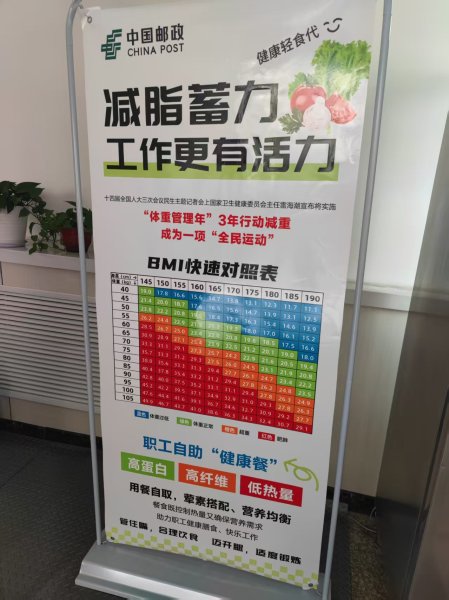 為了配合本次活動,本溪郵政工會在食堂立BMI快速對照表宣傳版,讓職工們及時了解自己的身體狀況。同時食堂每天中午特別為職工提供減脂餐,每天的減脂餐都不重樣。雞胸肉、蔬菜、糙米飯等。合理搭配減脂餐,既讓職工吃飽也要保證職工營養(yǎng)攝入。